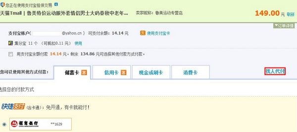 或在支付寶收銀臺付款選擇找人代付;