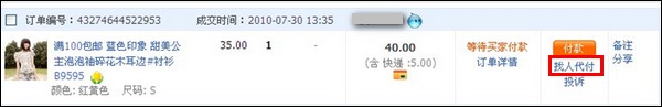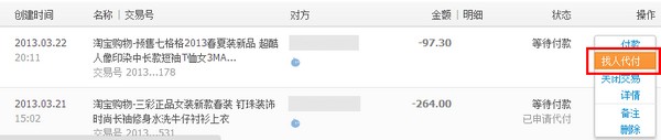 或者在【我的淘寶】——【已買到的寶貝】中未付款的交易可以用【找人代付】;