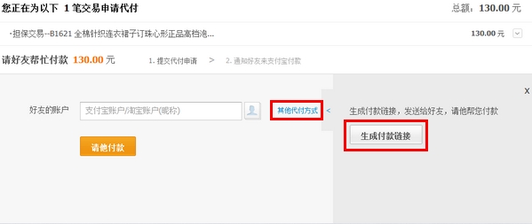 點“找人代付”後,會出現如下頁面,再選擇“其他代付方式”——》生成付款鏈接